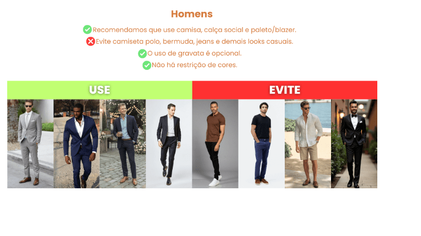 • Mulheres, caso vá de salto, recomendamos um confortável, pois há um gramado no local da cerimônia.